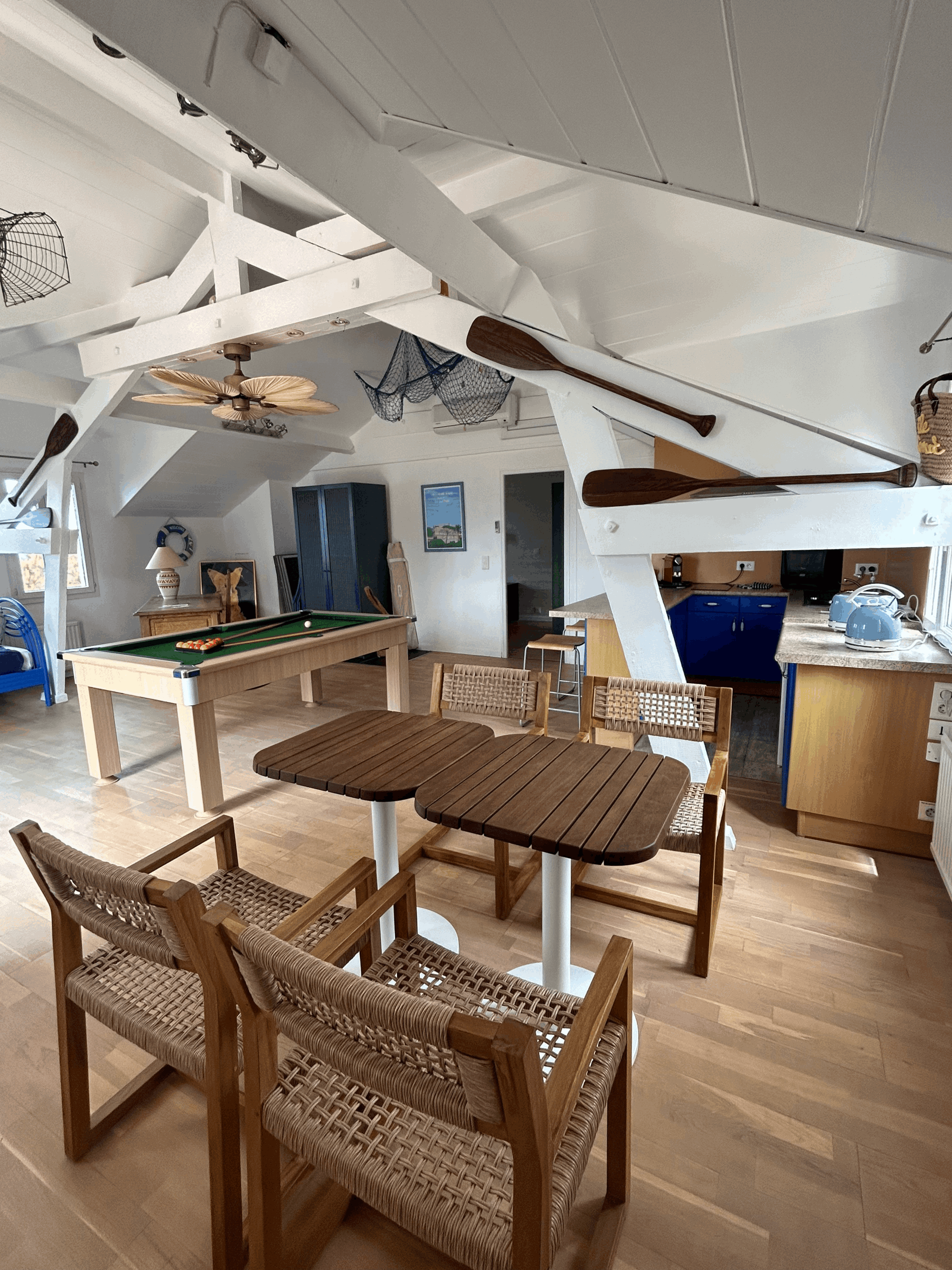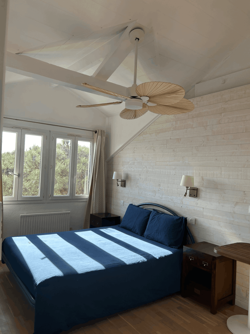 1 chambre avec 1 lit 160 cm, salon 50 m2, cuisine-bar, four Crisp, douche à l’italienne-wc, coffre fort, chauffage, ventilateur tropical.